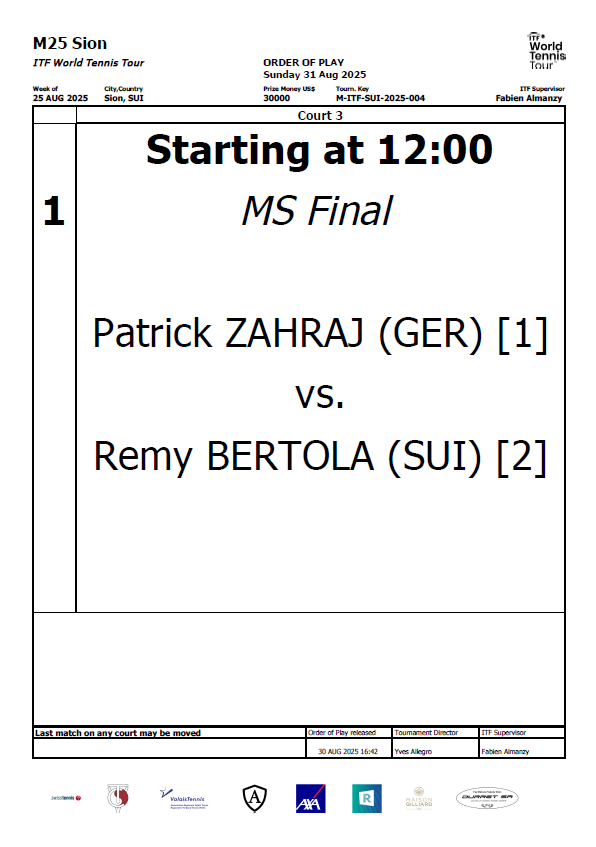 AXA Open de Sion. International Men's M25 ITF tournament.24th to 31st August 2025. TC Valère, Sion.Tournament organised by Five Sports Management.Tournament Director: Yves Allégro.